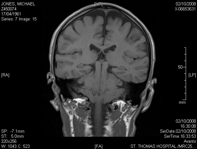 Image 7.15 — final scan image in which this object is visible — approximately 6mm to the rear of 7.14. The object is somewhat narrower and less circular here. It reaches its limit at this point, suggesting it may be 12-15mm in depth.