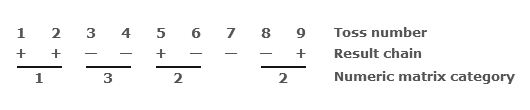 The ‘numeric matrix category’ describes the characteristics of pairs of sequential tosses by encoding an additional symbolic layer, which categorises them according to types 1, 2, & 3 as defined in the first table, but which can be understood in terms of a level of functional description.